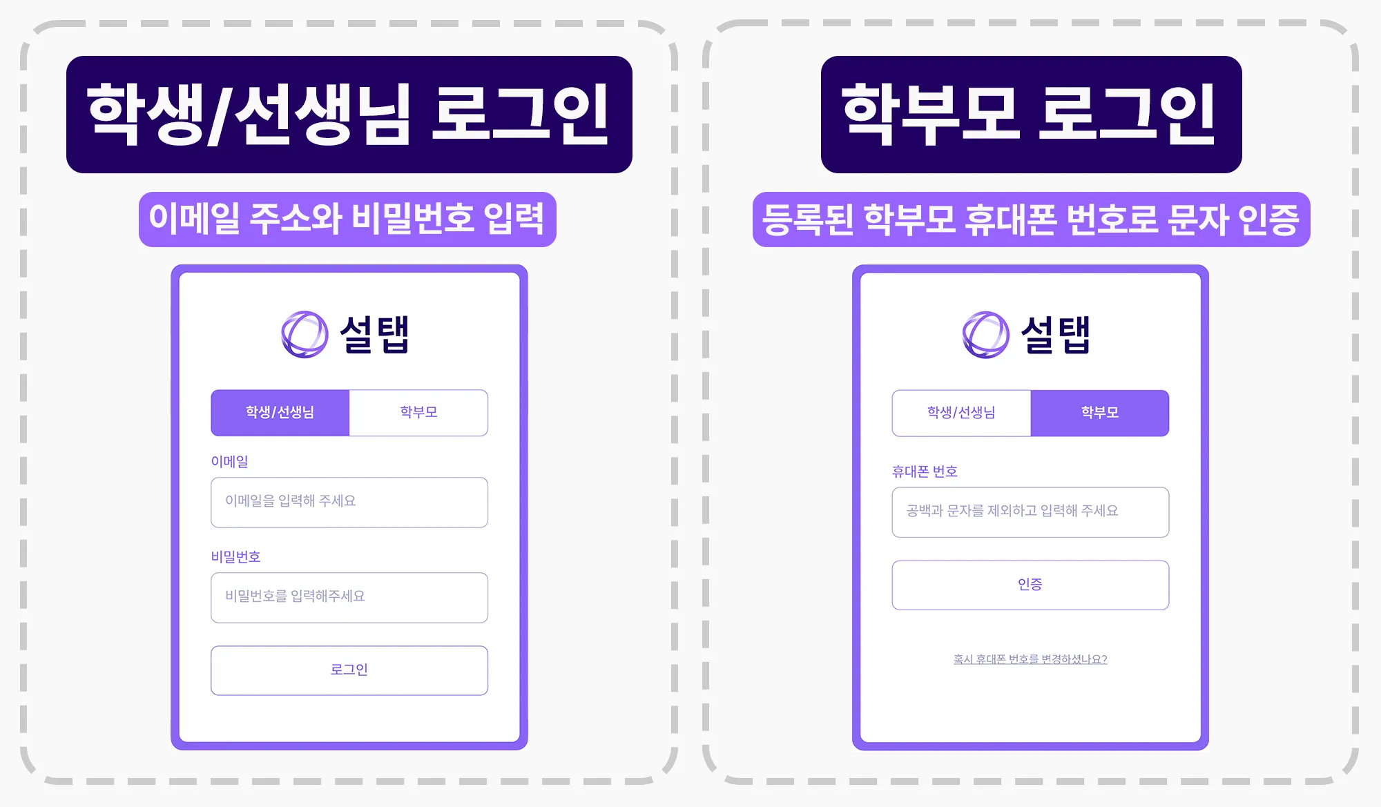 - 학부모 로그인 : 등록된 학부모 휴대폰 번호로 문자 인증