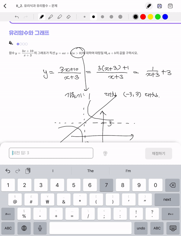 선생님께서 숙제를 채점하고 틀린 문제와 질문 표시를 위주로 설명해주셨어요.