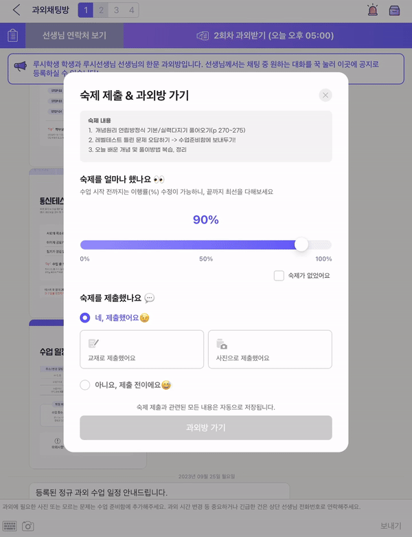 제출한 숙제는 과외방에서 확인할 수 있어요.