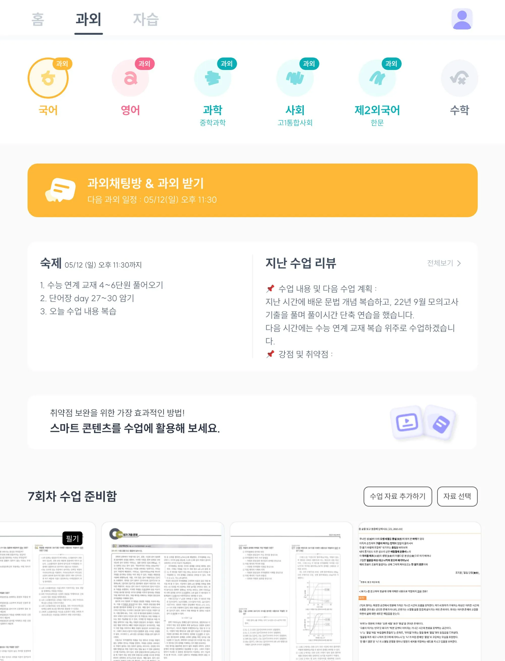 수업 준비함으로 보내 선생님과 함께 시간 관리 및 자습에 대한 점검을 할 수 있어요.