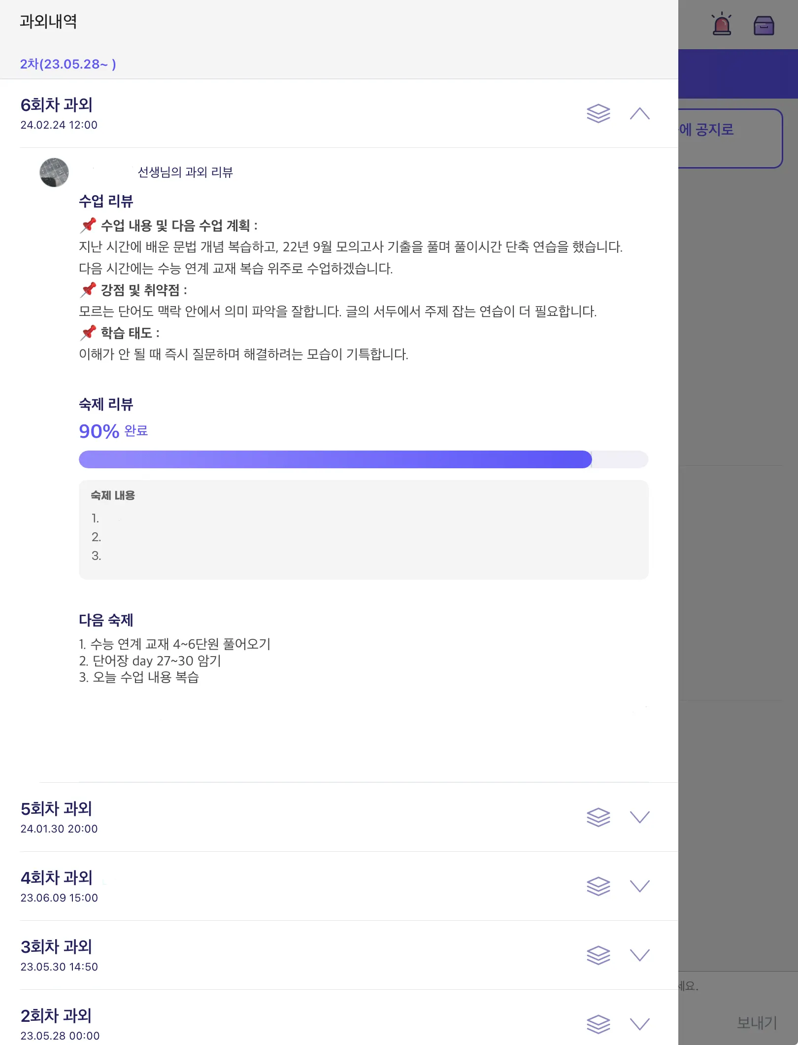 선생님께서 매 수업 후 작성해주시는 수업 리뷰로 나의 수업 기록이 쌓입니다.