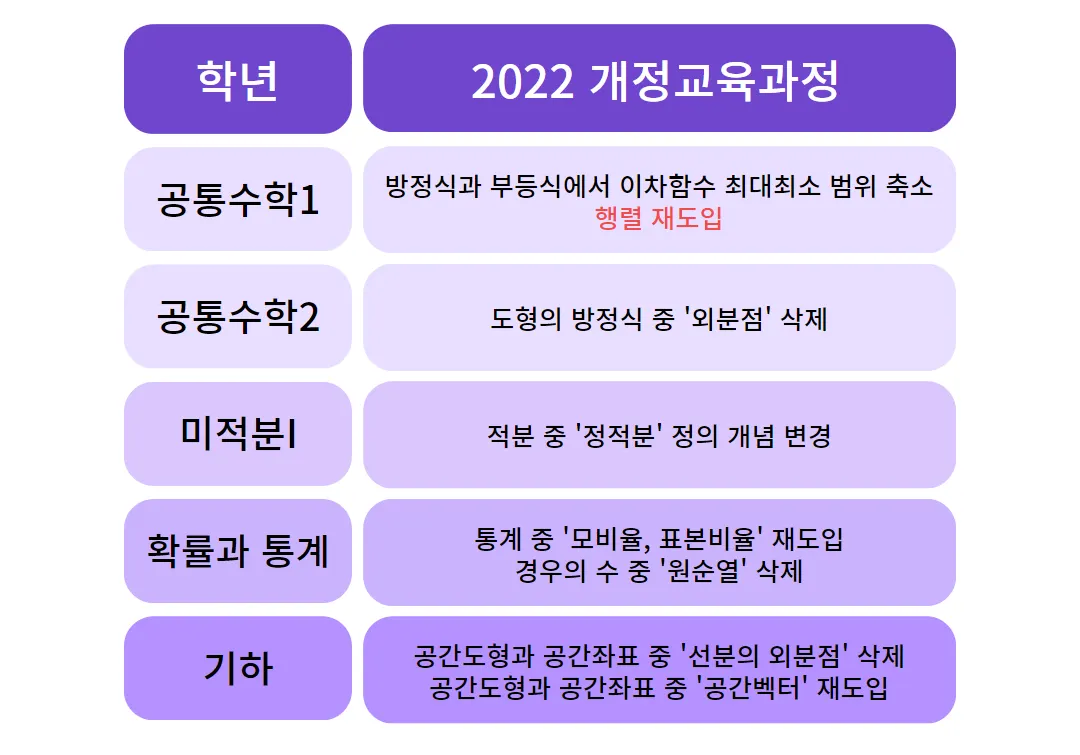 2015 개정 교육과정에서 삭제되었던 ‘공간벡터’가 재도입되며, ‘선분의 외분점’이 삭제됩니다.