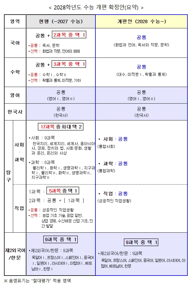 2027년 시행되는 2028학년도 수능은 2022 개정 교육과정이 반영되는 첫 수능입니다.