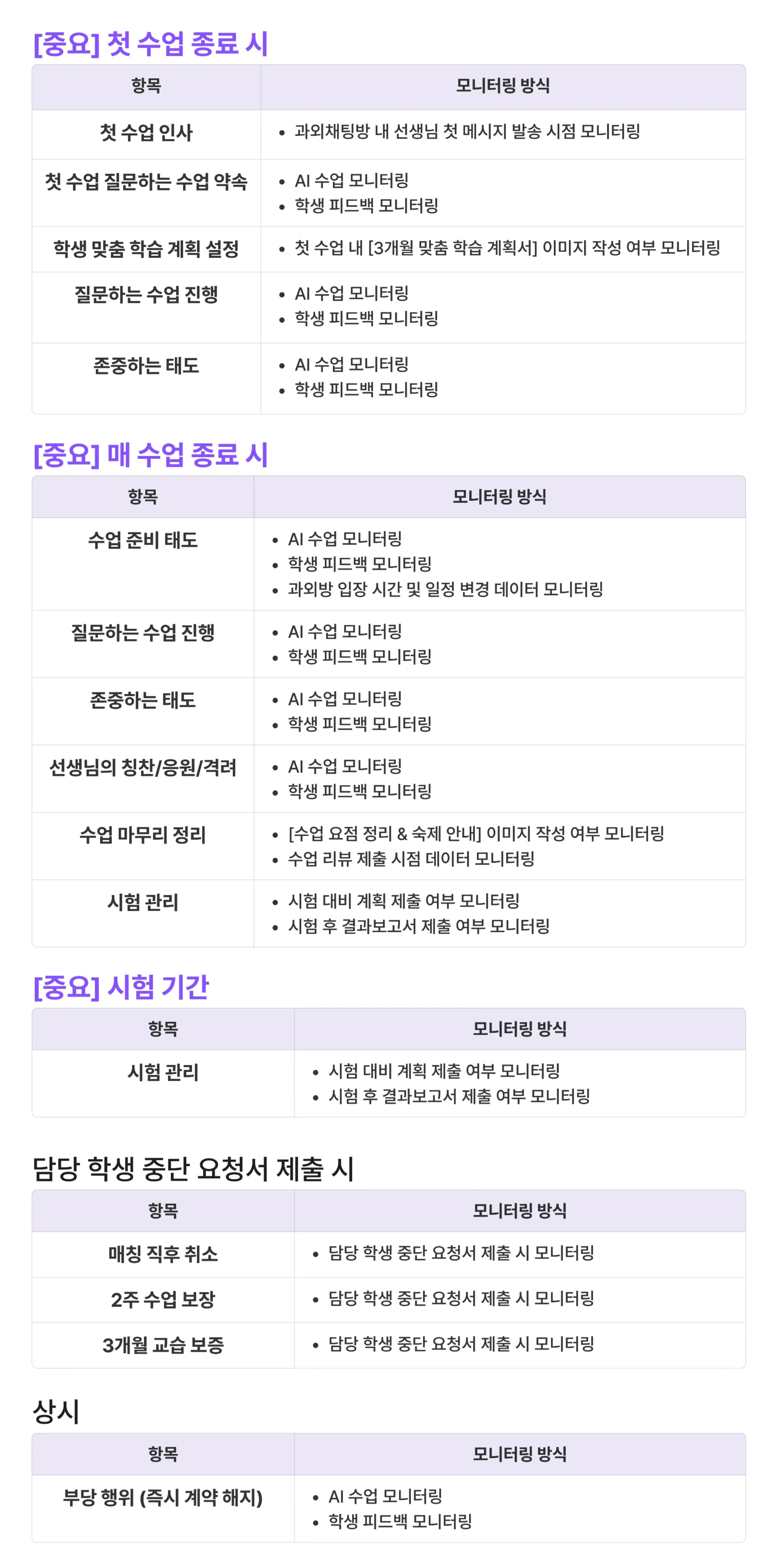 각 항목에 대한 모니터링 결과는 선생님께 지속적으로 공유드릴 예정입니다.