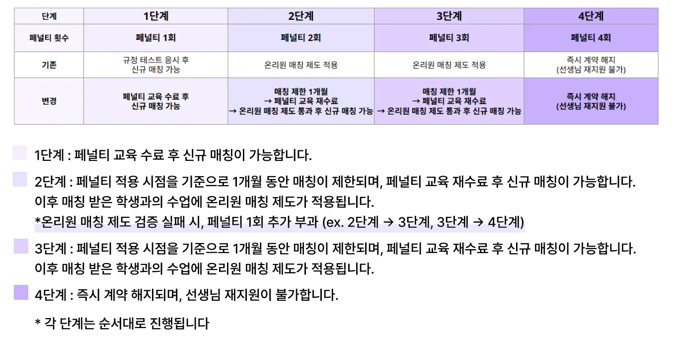 12월 1일부터 신규 매칭되는 수업의 첫 3회차에 한해 모니터링 및 페널티 부여를 시행할 예정이며, 2026년 내 전체 회차를 대상으로 관리 범위를 점진적으로 확대할 예정입니다.