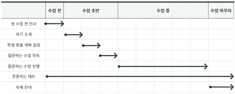 따라서, 아래의 5가지 항목은 첫 수업에서 반드시 실천해야 할 핵심 기준입니다.