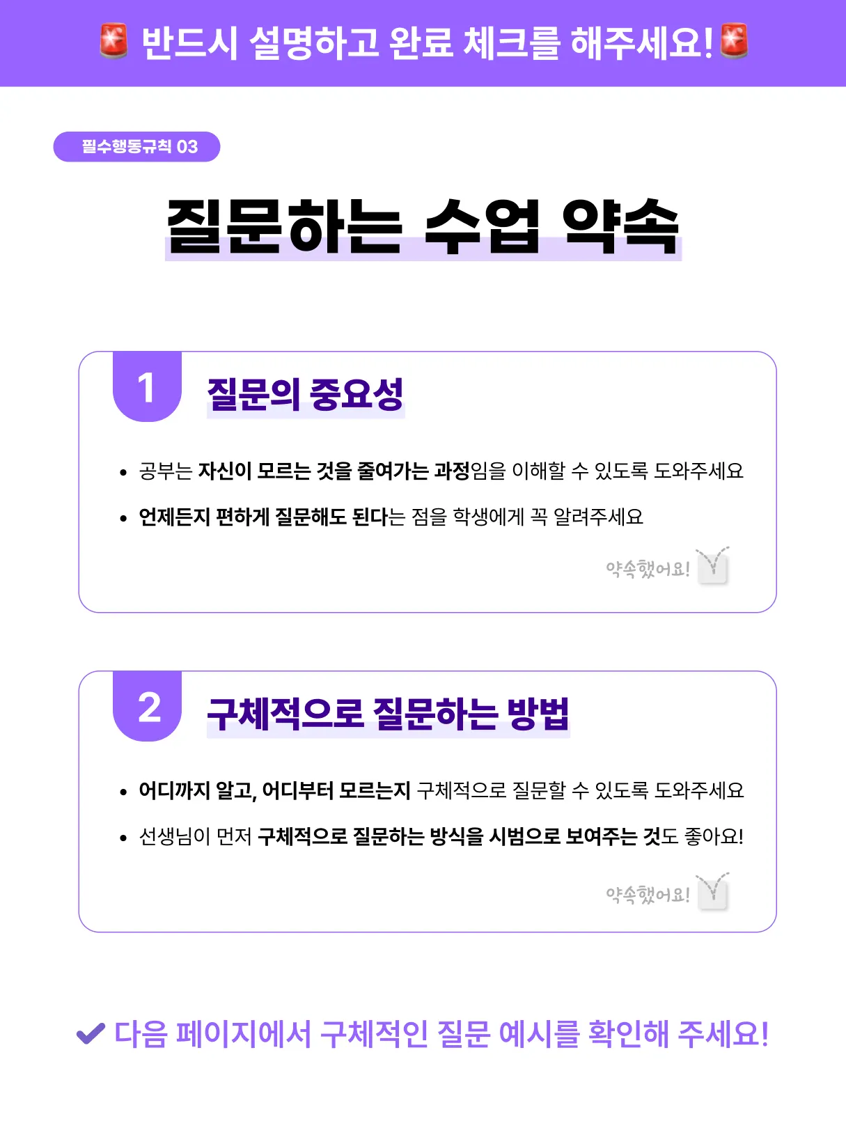 학생이 약속한 대로 ‘질문하는 수업’을 직접 경험할 수 있도록 이끌어주세요.