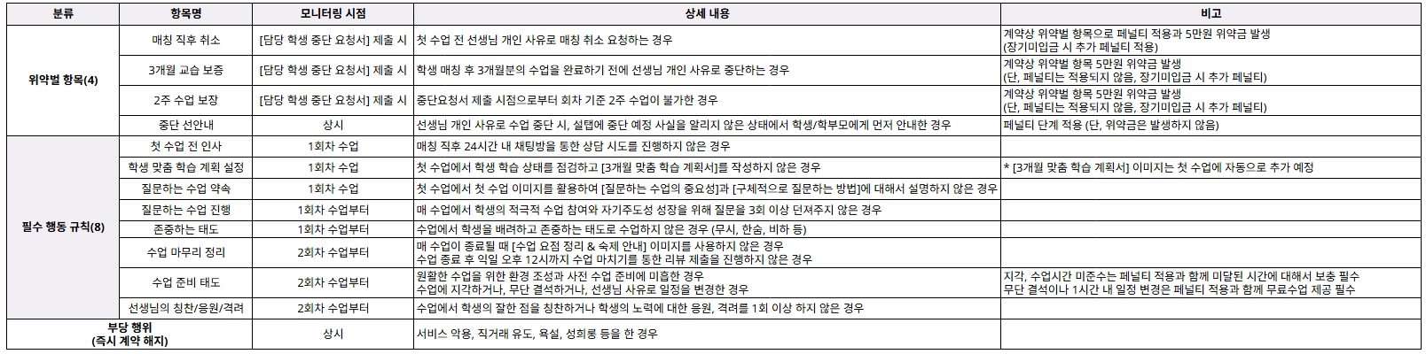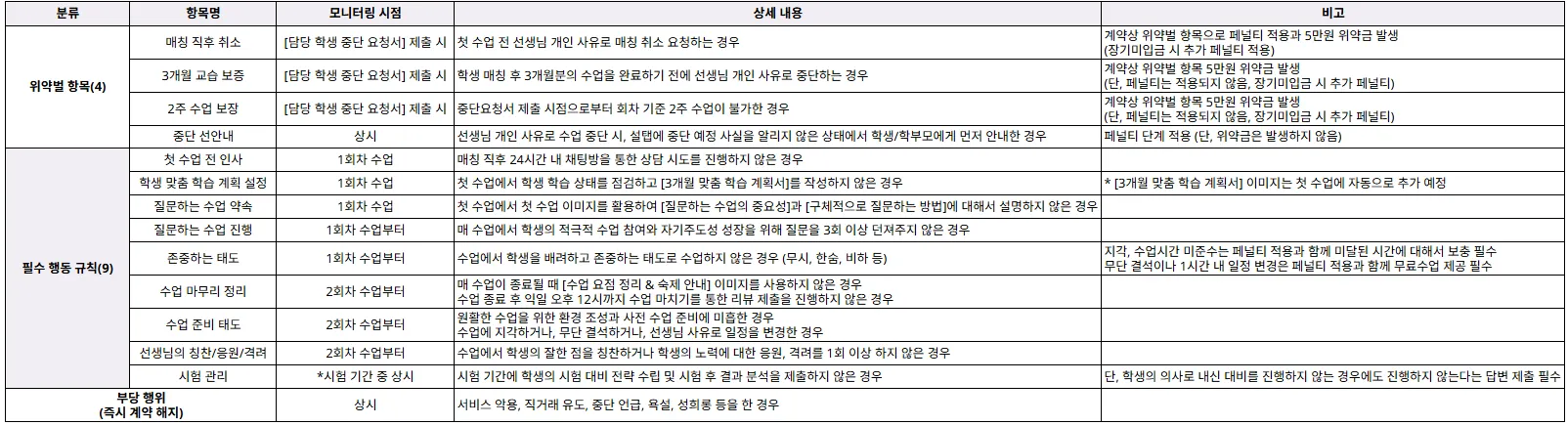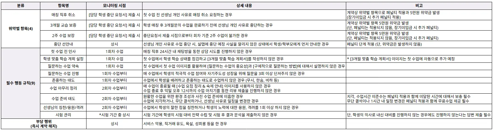 페널티 항목은 컴플레인 다수 발생, 선생님 변경 및 설탭 수업 중단, 계약 위반에 해당하는 항목들로 구성되었습니다.