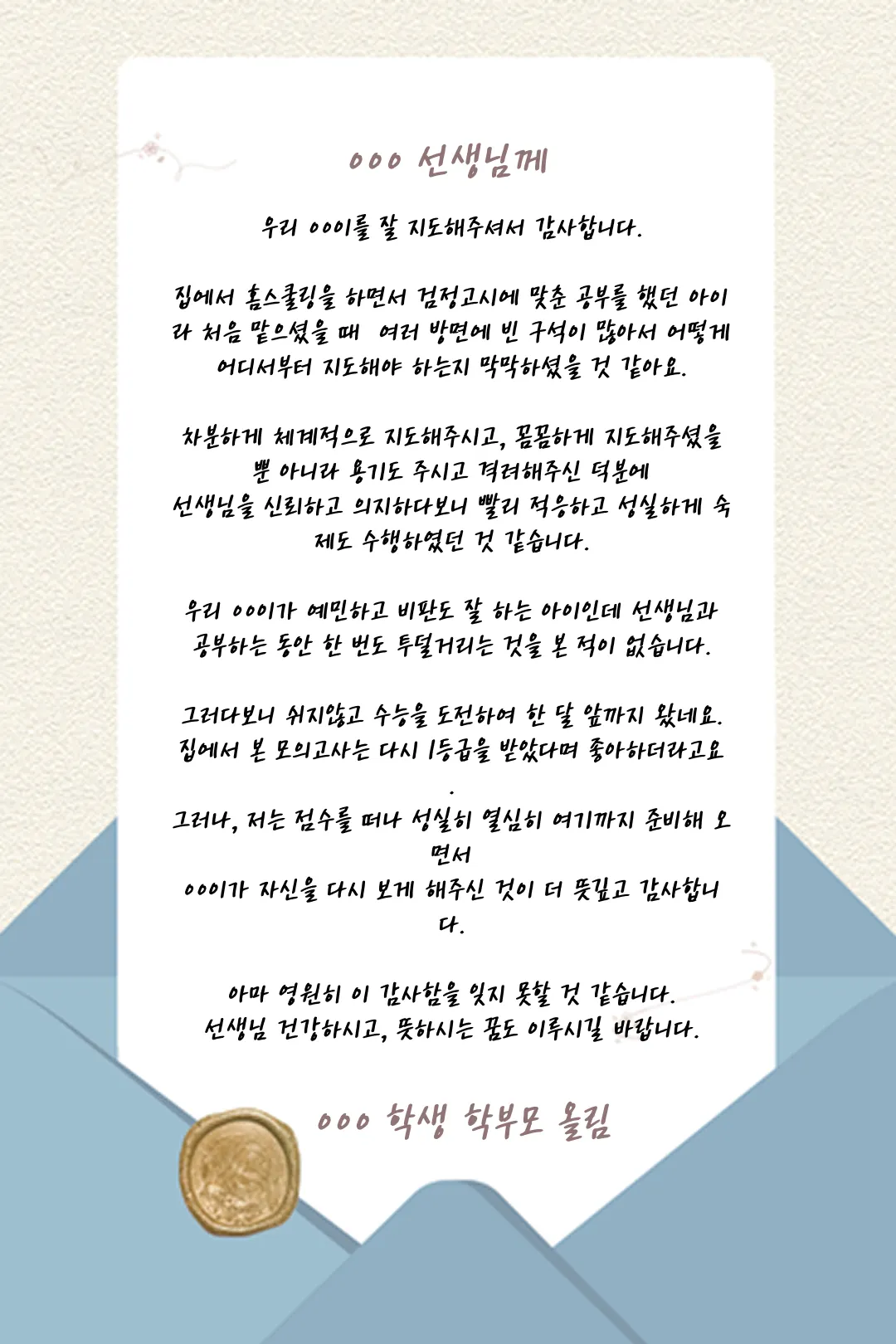“수험생을 위해 열심히 수업해 주신 선생님께 감사 편지를 작성해 주세요!”