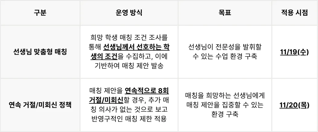 '선생님 맞춤형 매칭'과 '연속 거절/미회신 정책'을 소개하겠습니다!