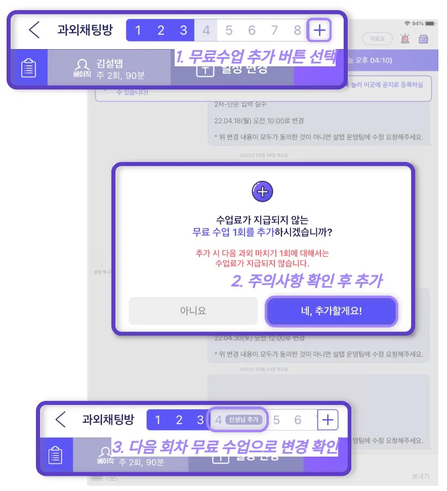 무료수업 추가 시, 예정된 바로 다음 회차가 무료수업으로 전환 (회차 지정 불가)