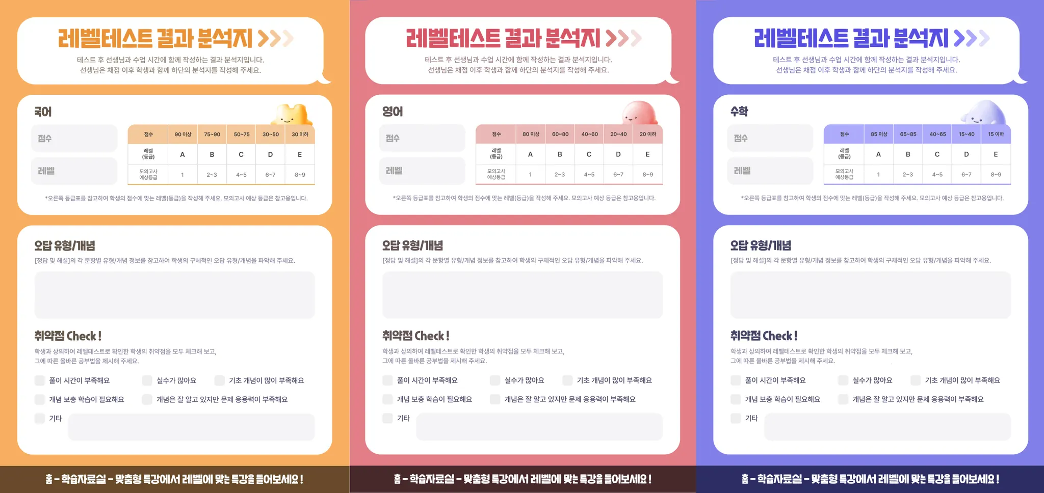수업 시간에 레벨테스트 채점 및 풀이 진행 후, 맨 뒷장의 결과 분석지 작성