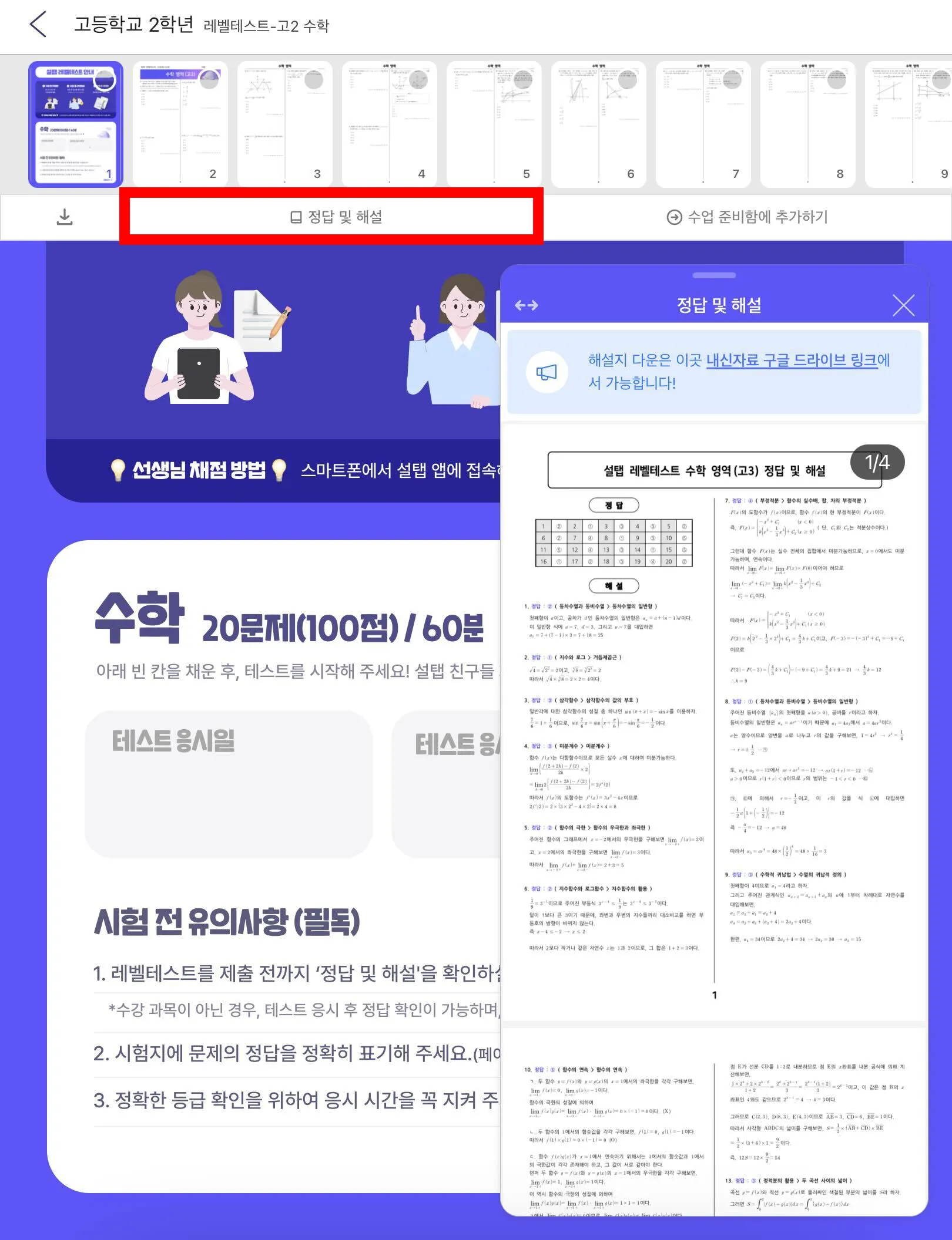 선생님은 레벨테스트 자료 및 정답과 해설 확인 가능