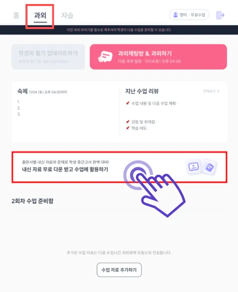 국어의 경우, 학교 교과서의 내용과 선생님의 필기, 선생님이 나누어준 유인물에서 대부분 나온다고 해도 과언이 아닙니다. 따라서 수업을 시작하기 전 학교 교과서의 선생님의 필기와 유인물 이미지를 학생에게 요청하여 수업에 활용해 주세요.