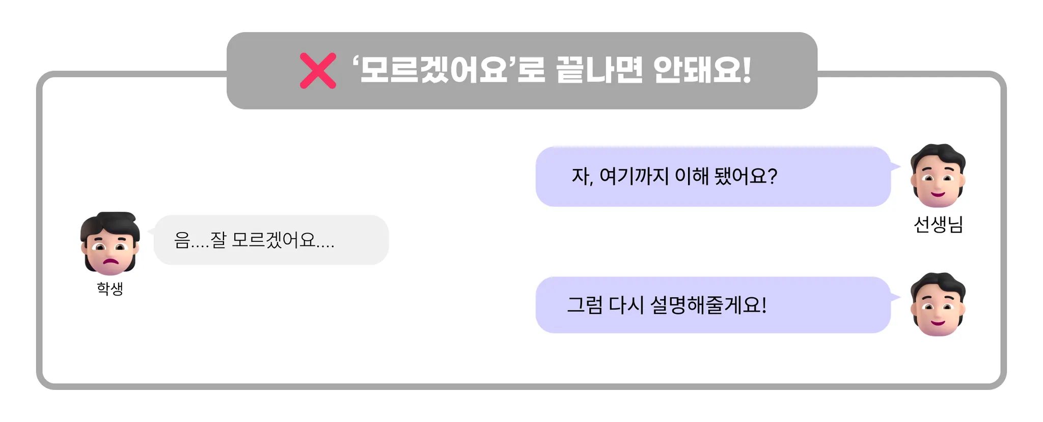 보통 “음… 잘 모르겠어요…” 라고 답을 하곤 해요! 이때, 바로 다시 설명해주는 건 좋은 방법이 아니에요.