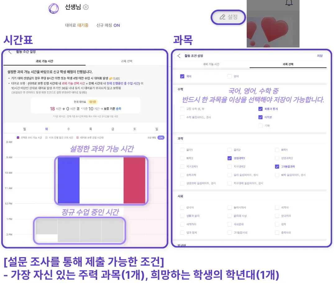 (예 : 성별, 과외 형태, 수업 유형(내신+수능), 세부 파트, 수업 스타일 등 설정 불가)