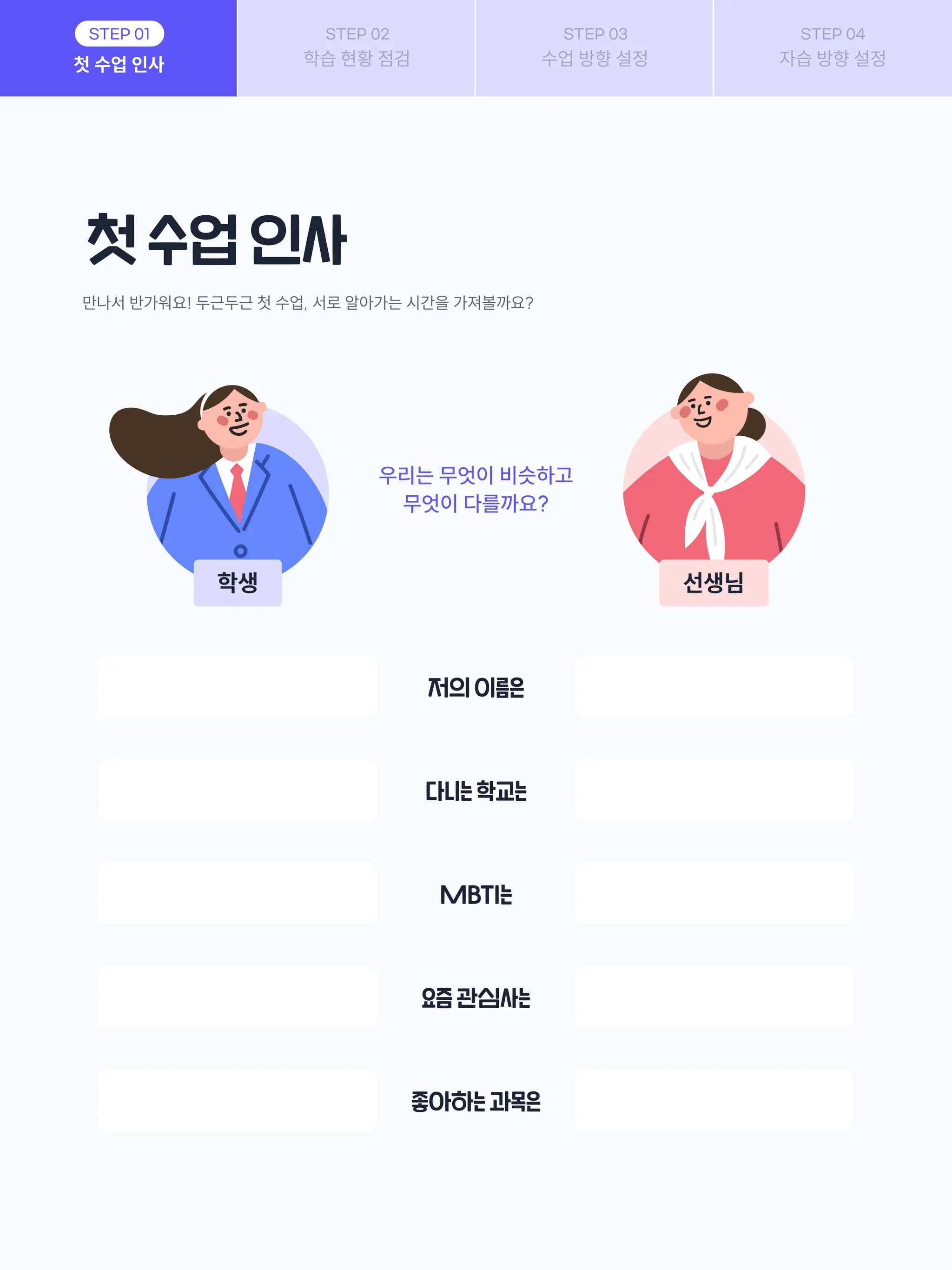첫 수업 인사와 학습 방향 설정 후 정규 수업을 진행해 주세요.
