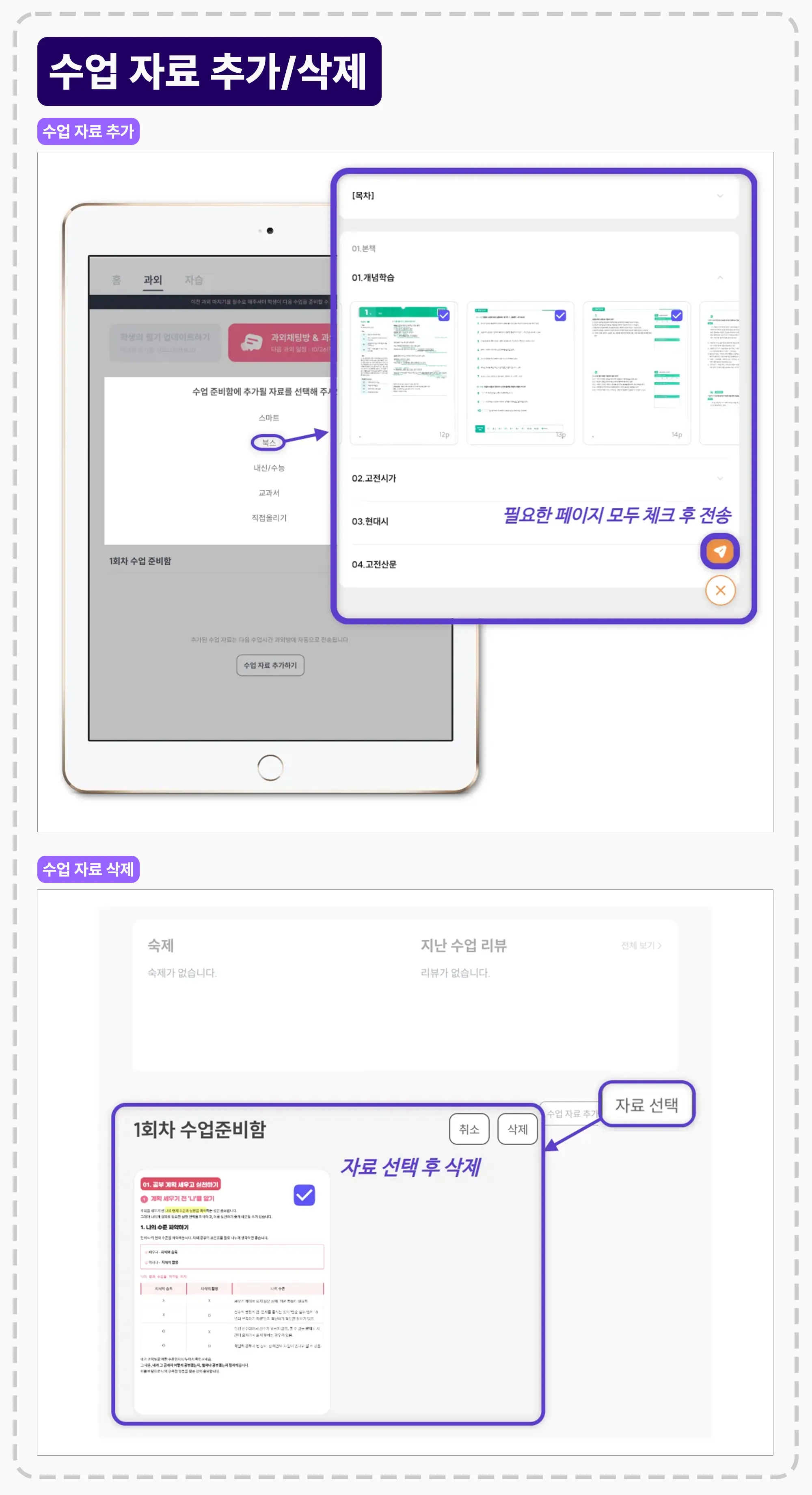 수업 준비함에서 필요한 자료 유형 선택 후 필요한 페이지를 한 번에 전송할 수 있습니다.