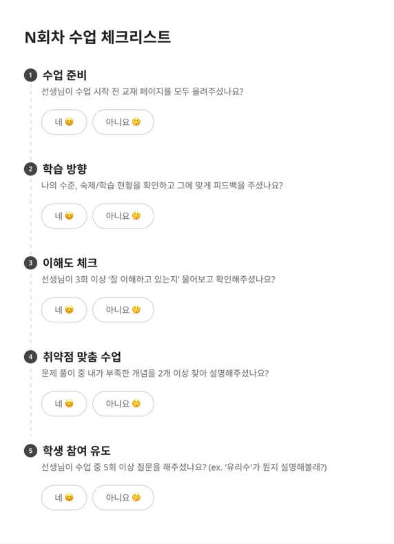 수업에 잘 반영할 수 있도록 돕기 위해 수업 리뷰 방식이 변경되었습니다. (23년 2월 시행)