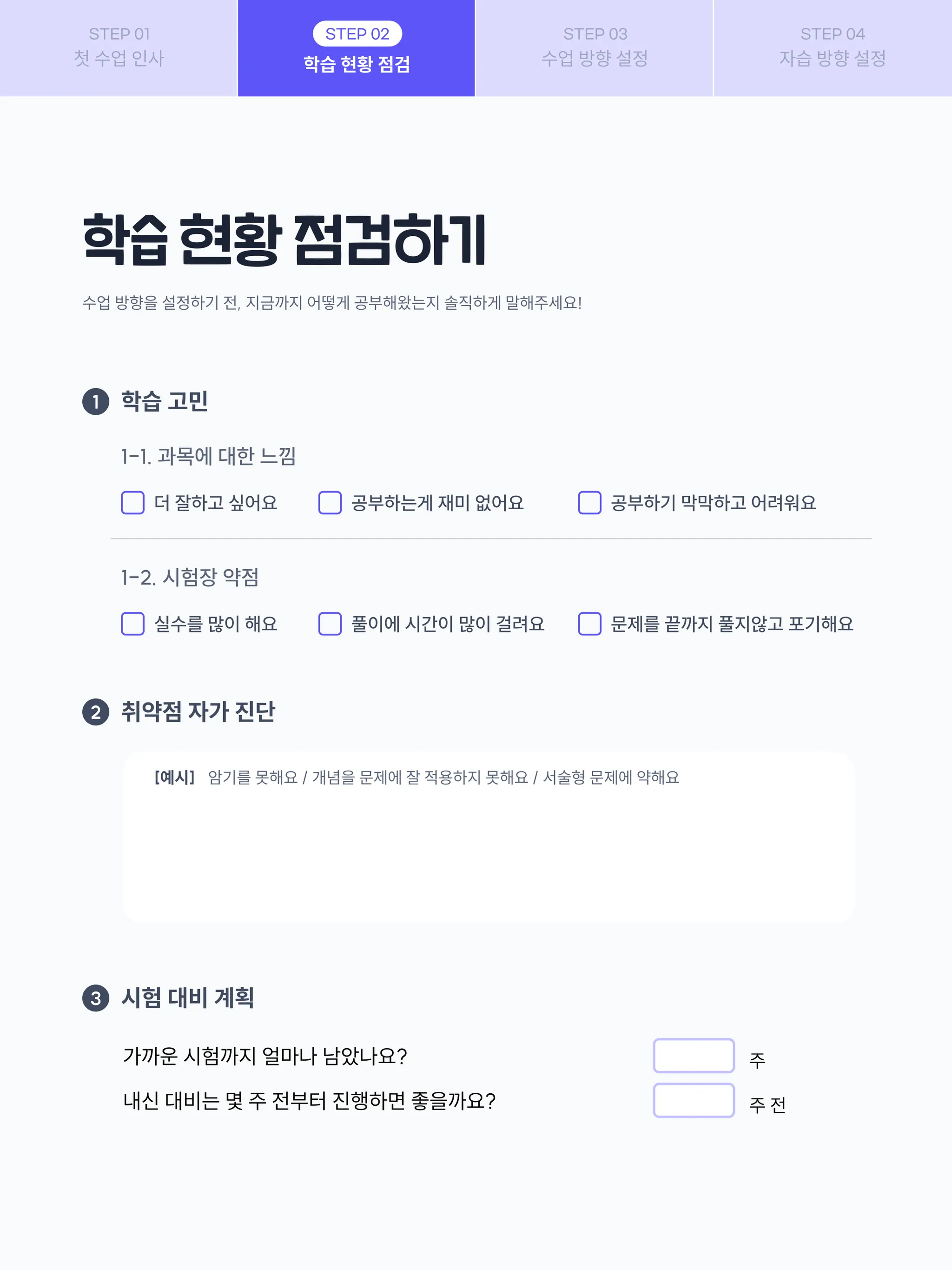 학생의 현재 학습 현황을 점검하고 학습 고민/취약점/시험 일정/레벨테스트 결과 등을
