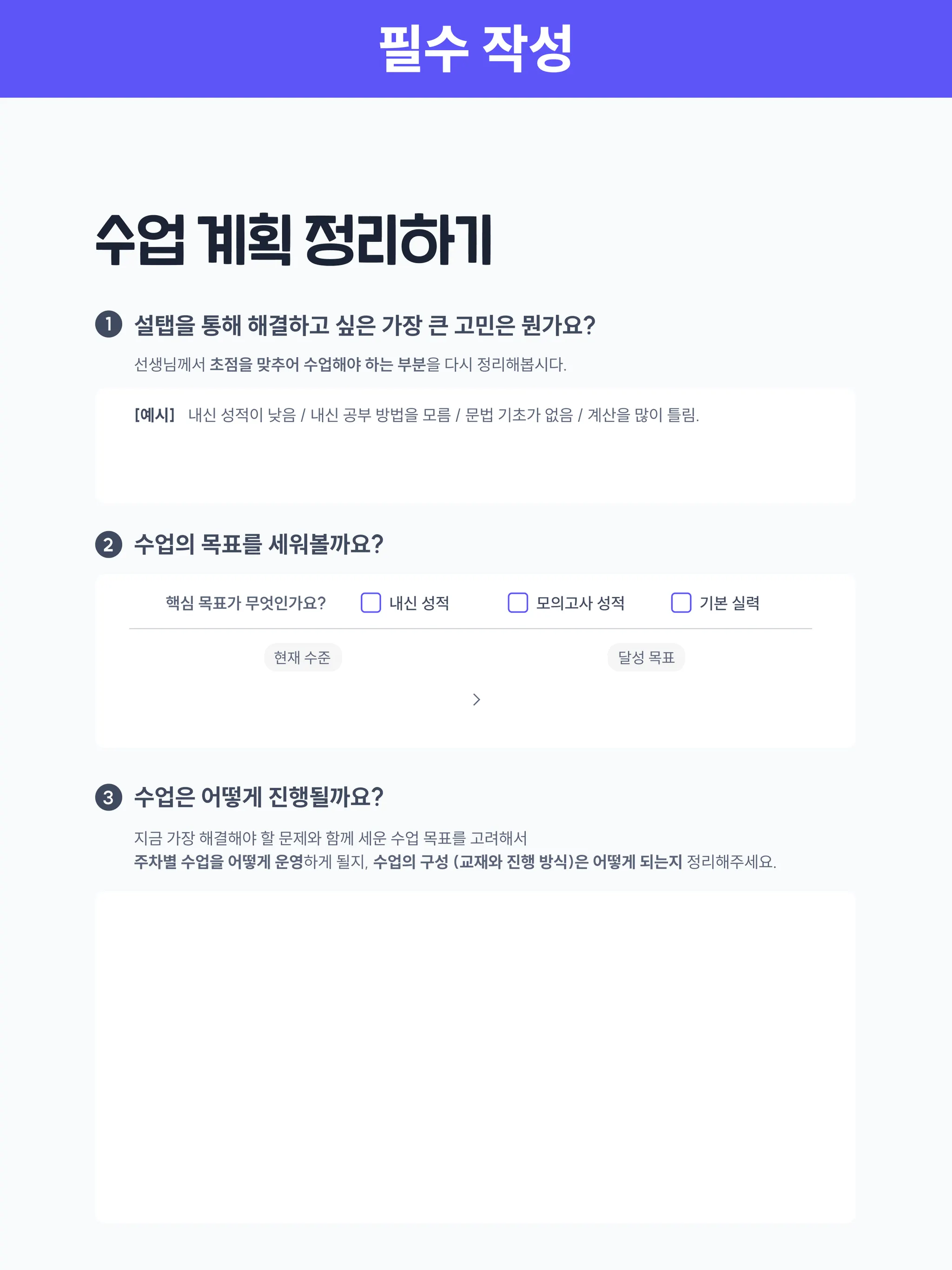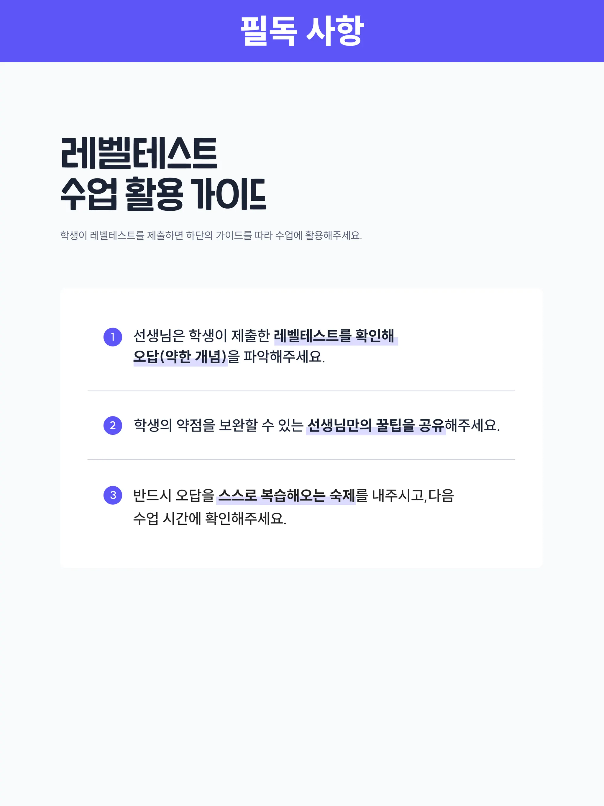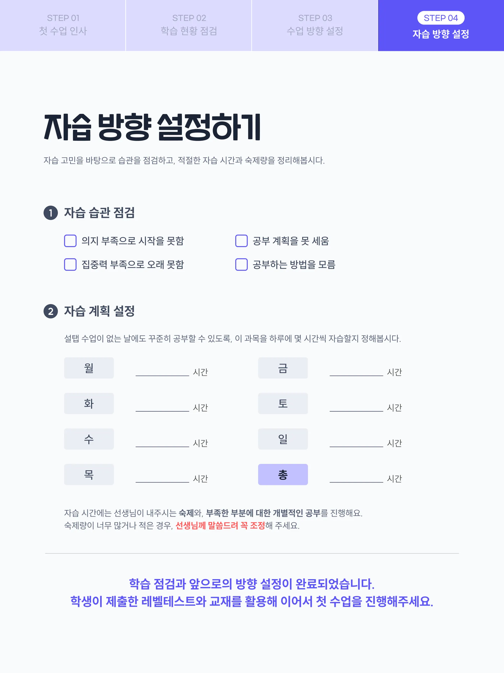바탕으로 학생과 함께 수업 및 자습 방향을 설정해 주세요.