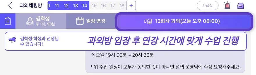 연강 수업을 진행한 회차 과외 마치기 후 바로 다음 회차 과외방에 입장합니다.