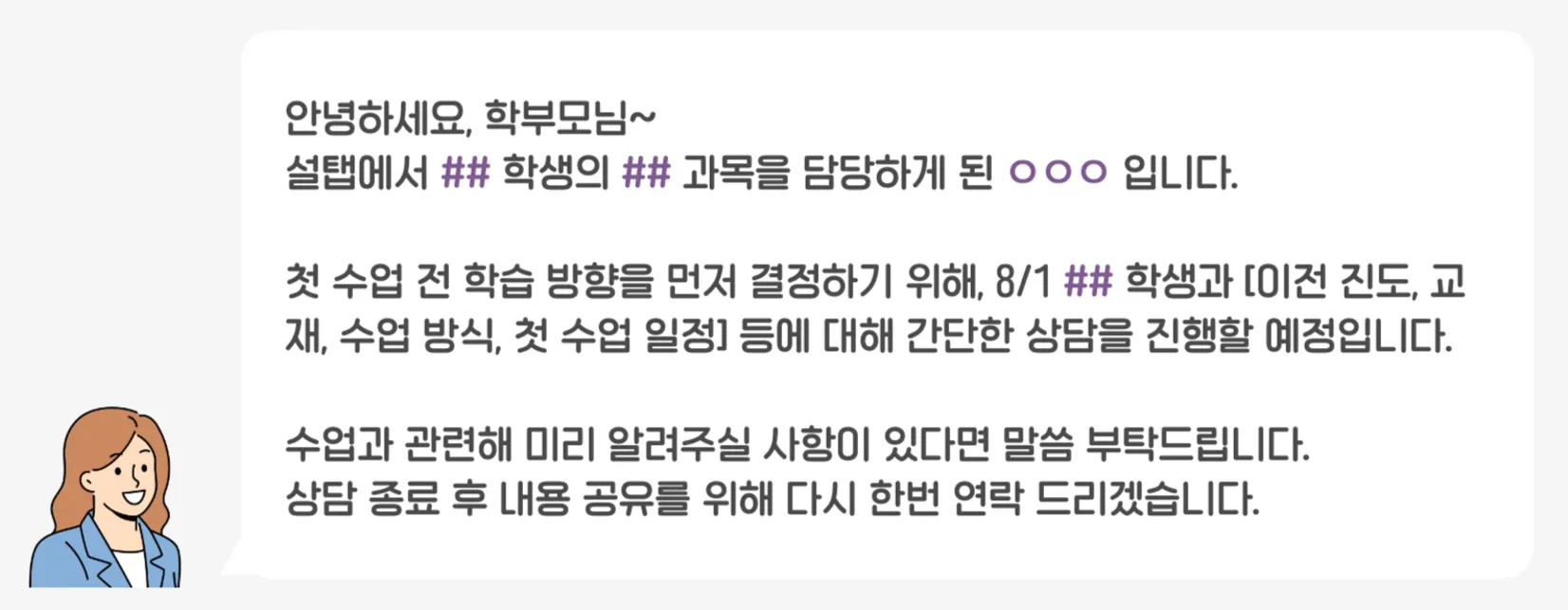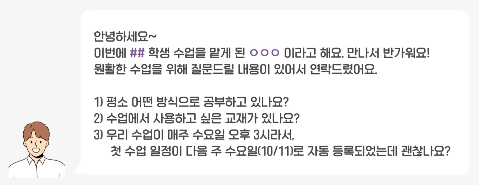 정규 일정을 확인하셨다면, 학생 & 학부모님과 첫 인사를 나눠보세요!