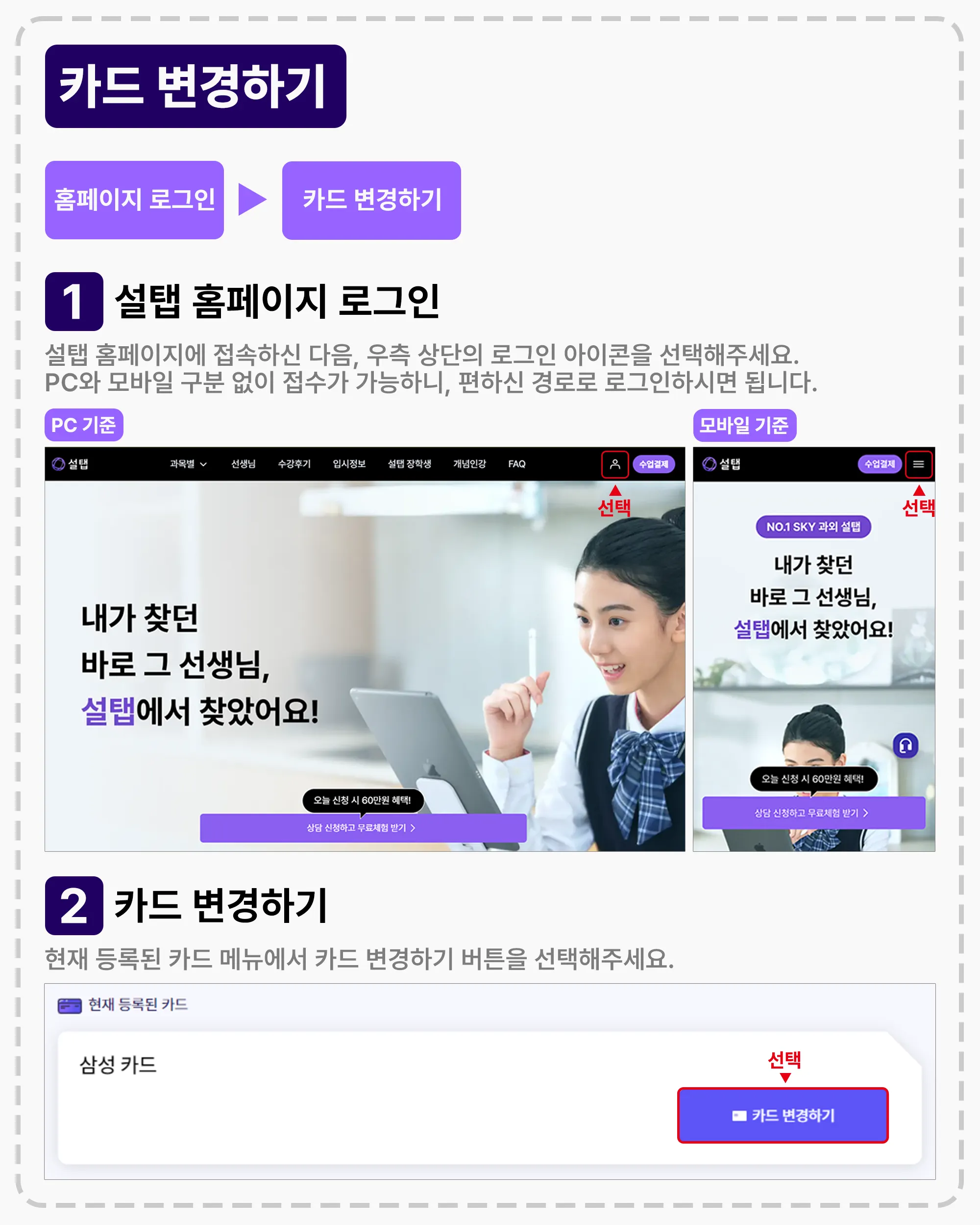 설탭 홈페이지 로그인 후, 등록된 카드 정보의 [카드 변경하기] 버튼을 선택해주시면 됩니다!