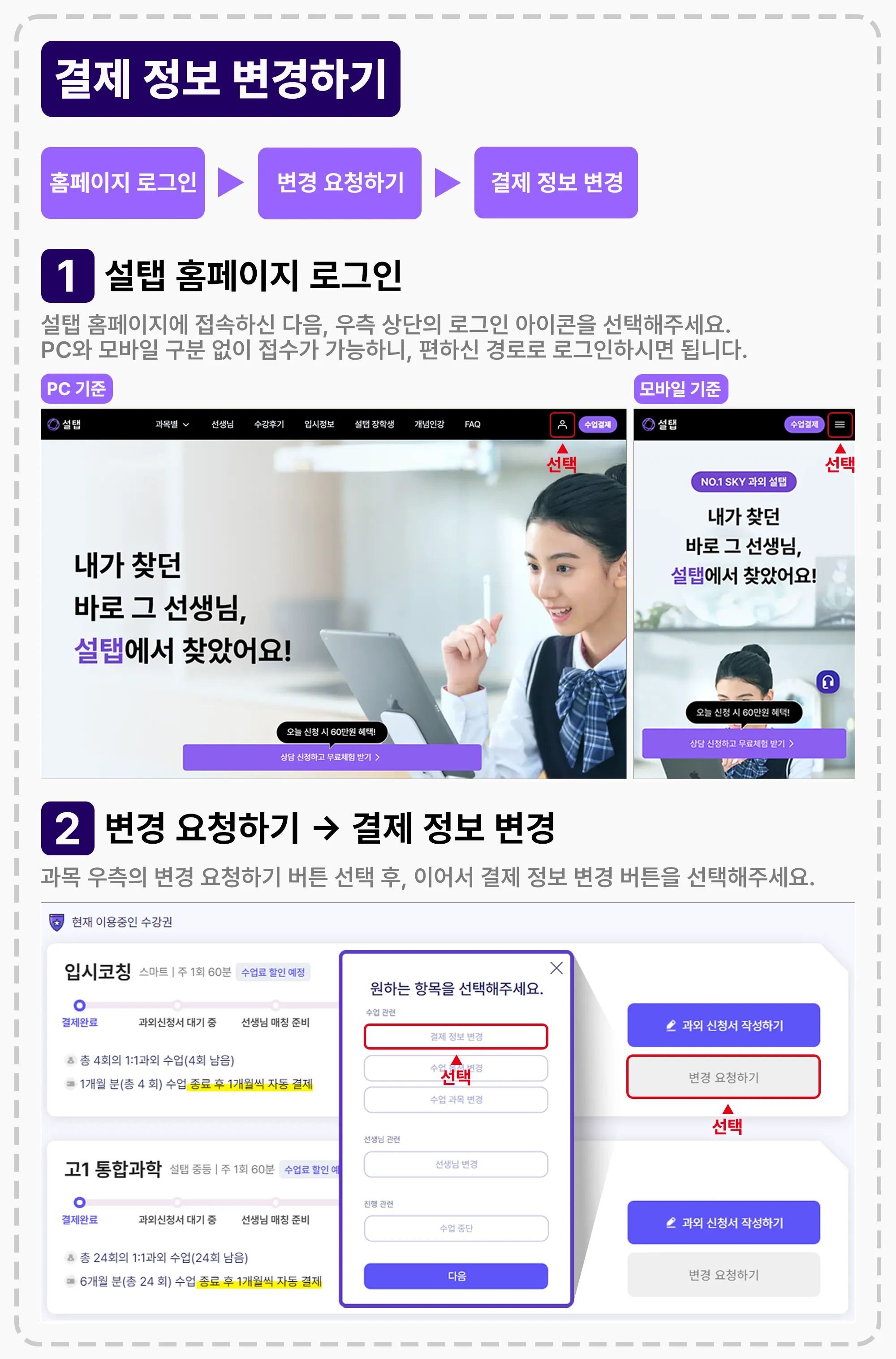 설탭 홈페이지 내에서 이미 결제된 정보 혹은 다음 결제 정보에 대해 변경이 가능합니다.