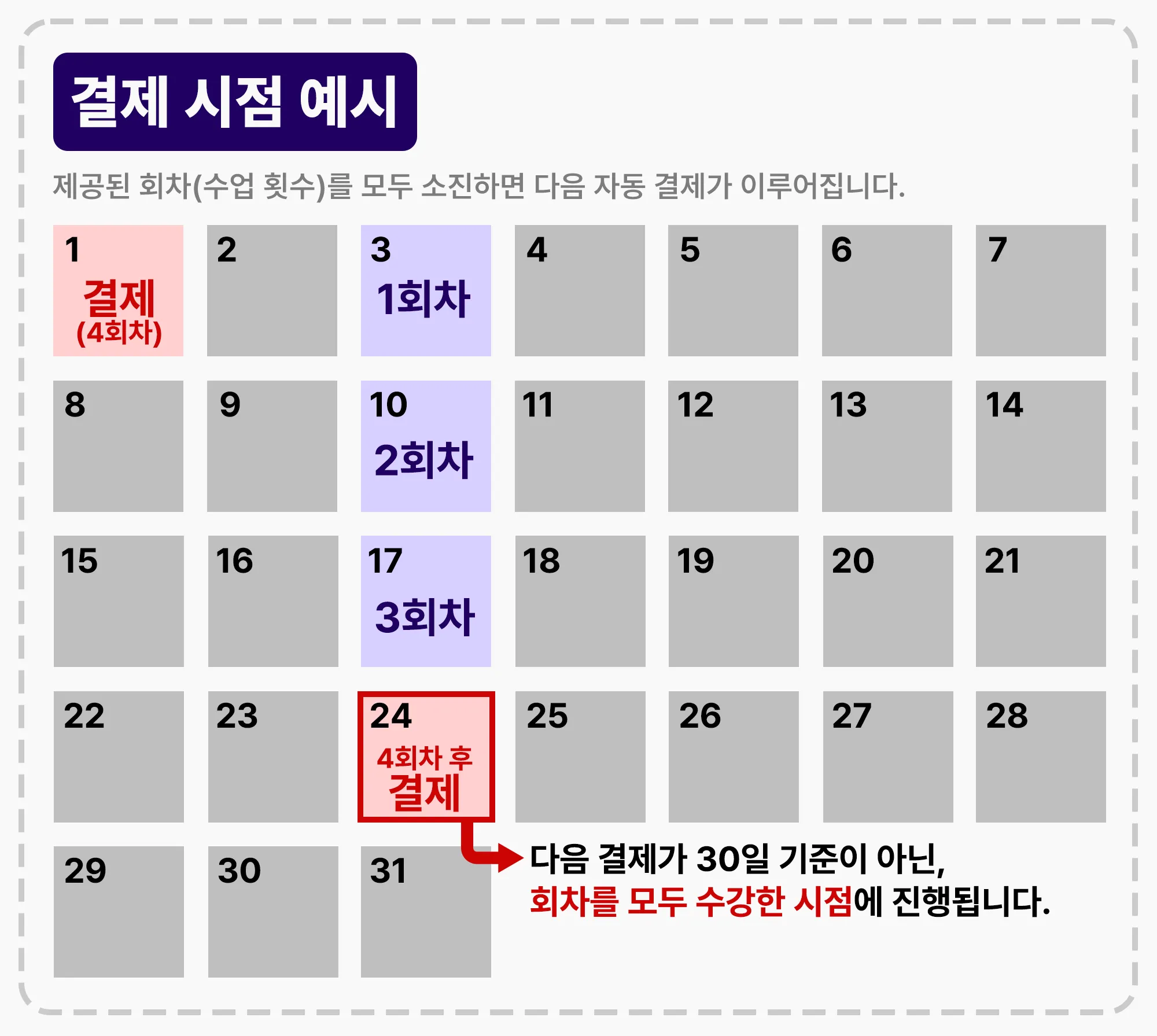 따라서 결제 일자는 별도로 정해져 있지 않으며, 결제 후 제공 받은 회차를 모두 수강하시는 시점에 다음 결제가 진행되는 점 안내드립니다.