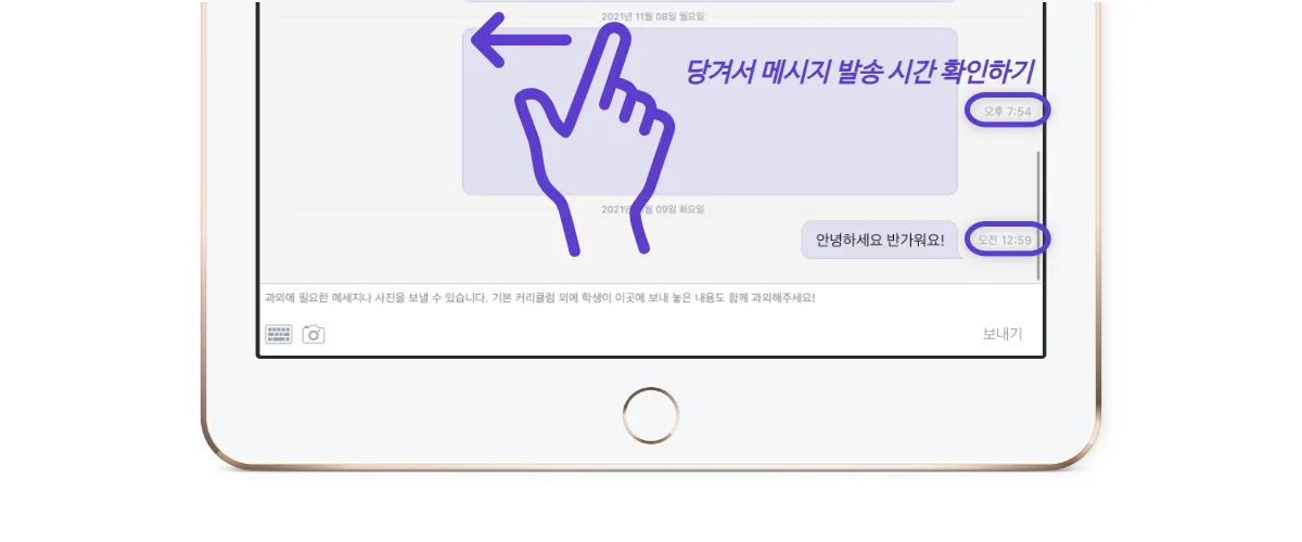 과외 채팅방 내 메시지를 왼쪽으로 당기면 발송 시간 확인이 가능합니다.