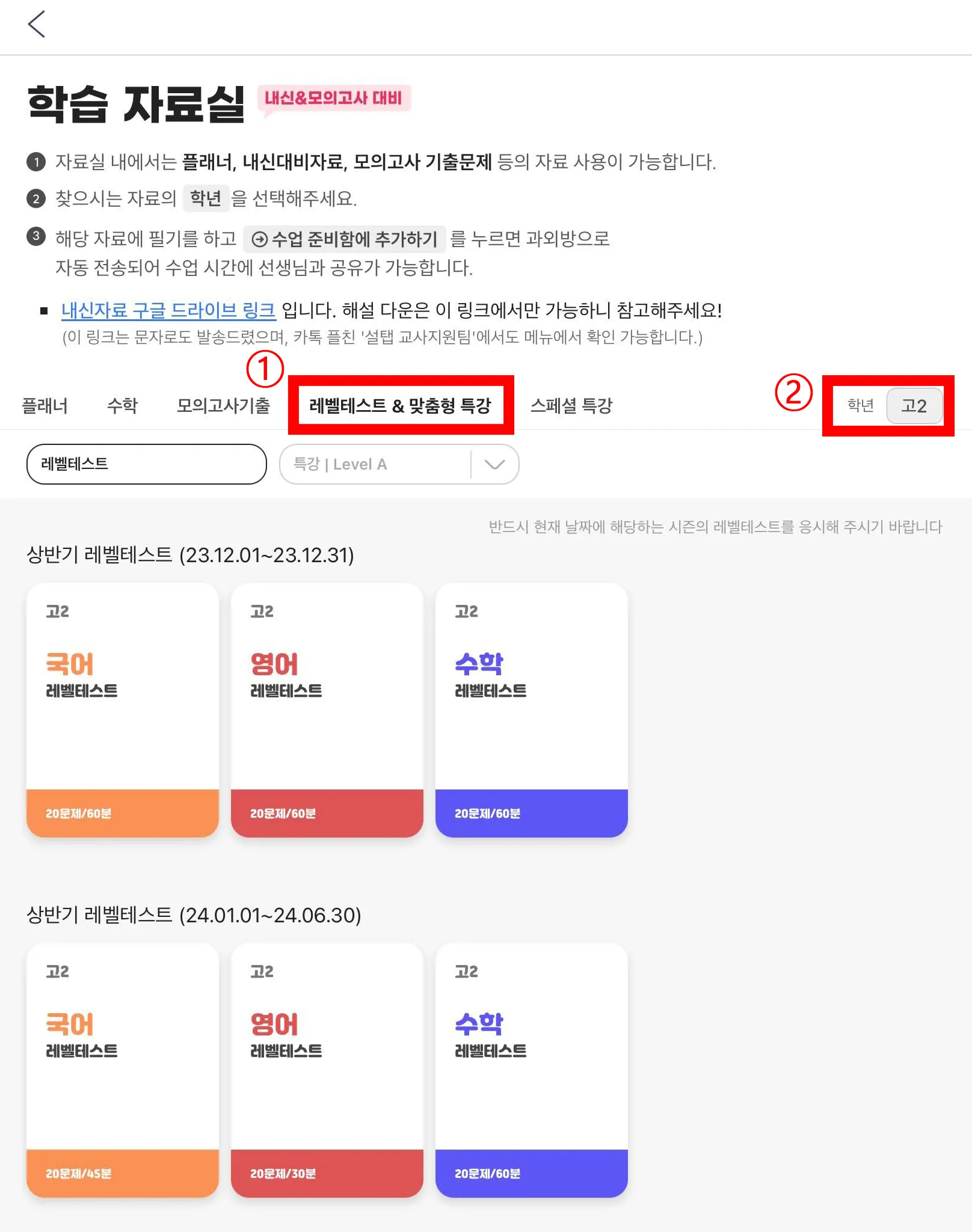 경로 : [아이패드] - [학생 홈] - [자습] - [학습자료실] - [레벨테스트 & 맞춤형 특강]
