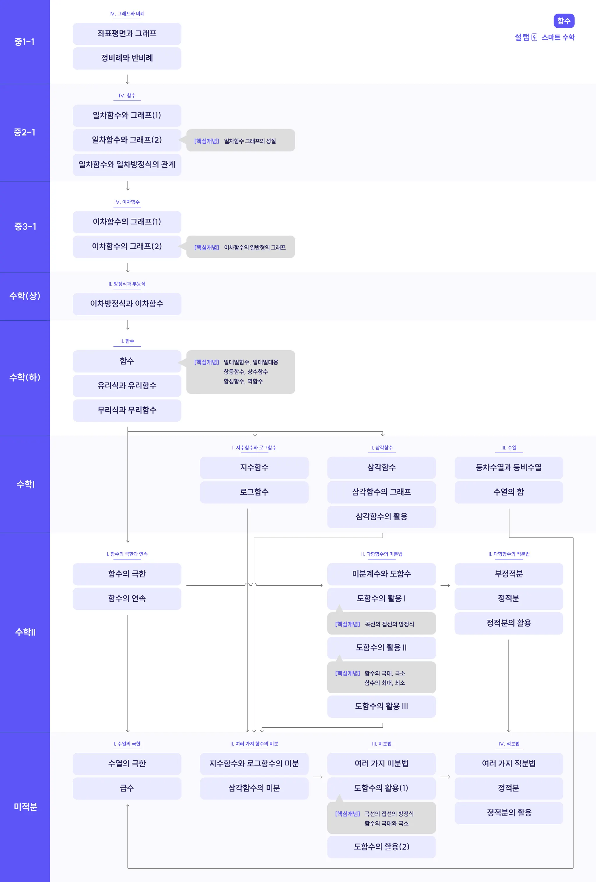 일차함수와 그래프, 이차방정식과 이차함수, 함수, 등차수열과 등비수열, 함수의 연속, 정적분 등