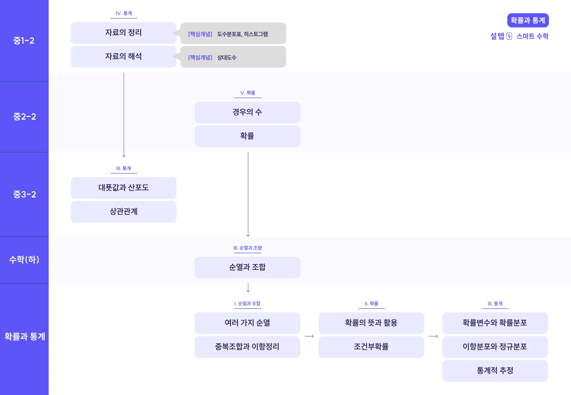 경우의 수, 대푯값과 산포도, 순열과 조합, 조건부확률, 이항분포와 정규분포 등