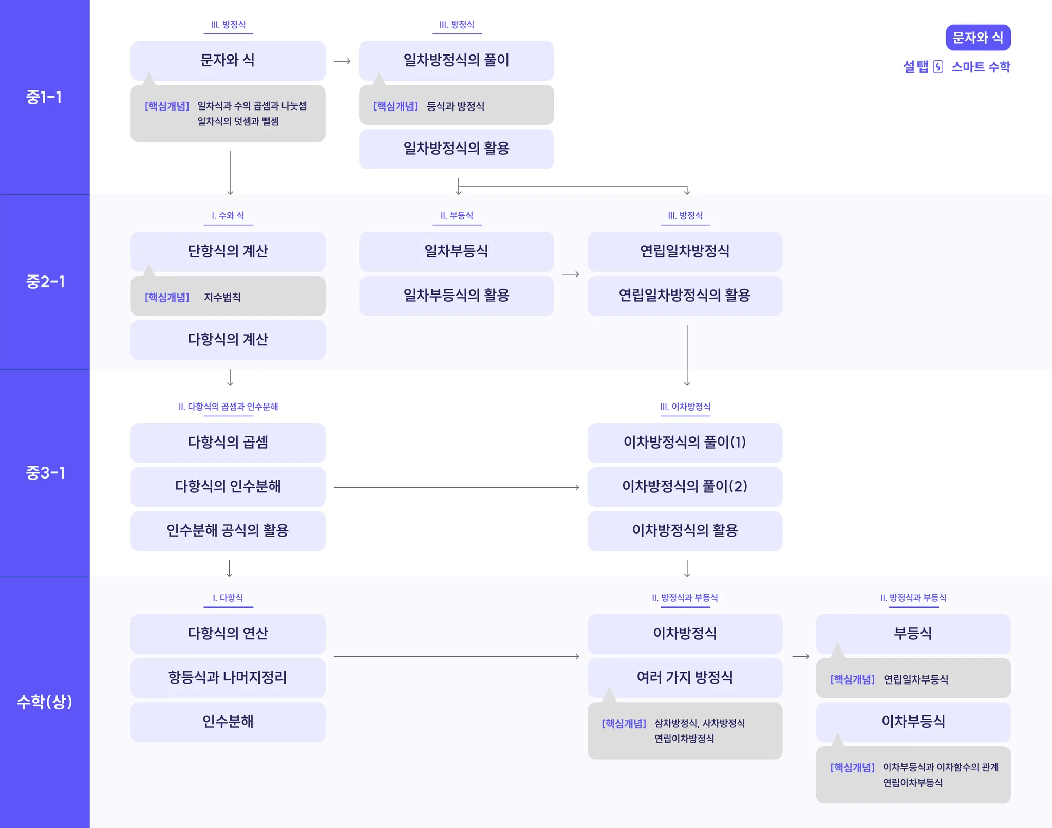 일차방정식의 풀이, 연립일차방정식, 다항식의 인수분해, 항등식과 나머지정리 등
