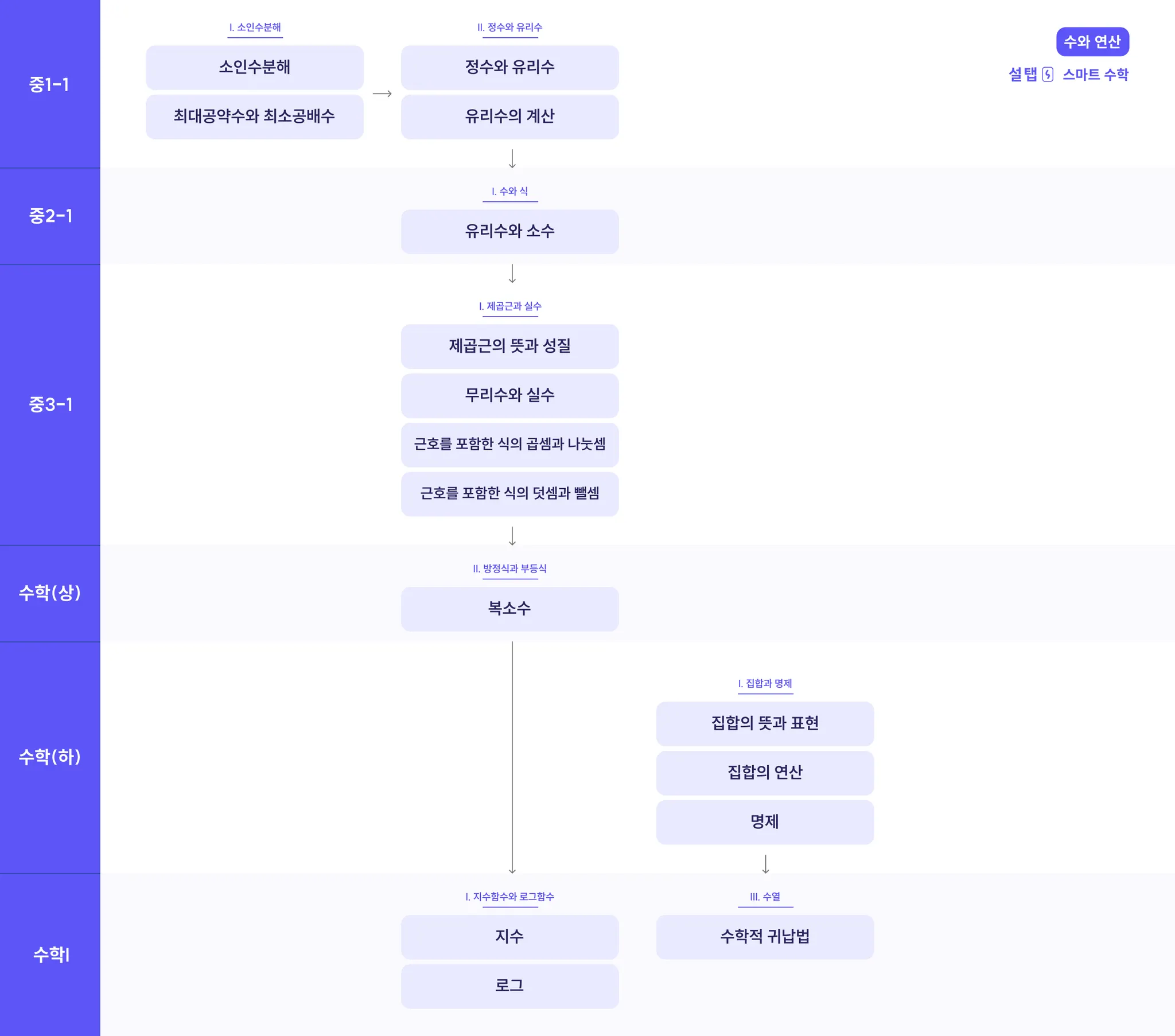 소인수분해, 유리수와 소수, 제곱근의 뜻과 성질, 복소수, 집합의 뜻과 표현, 지수, 로그 등