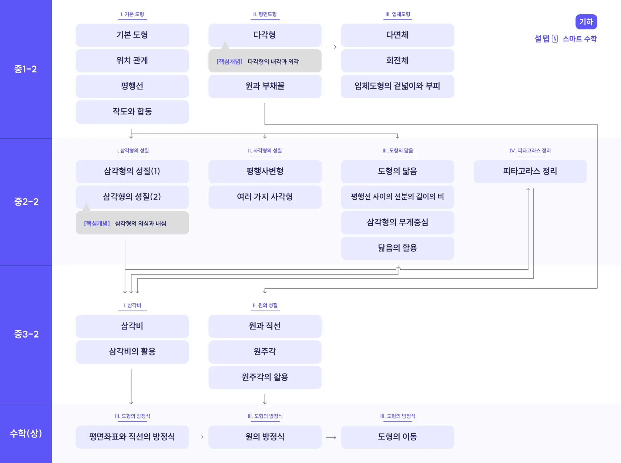 다각형, 도형의 닮음, 피타고라스 정리, 삼각비, 평면좌표와 직선의 방정식, 원의 방정식 등