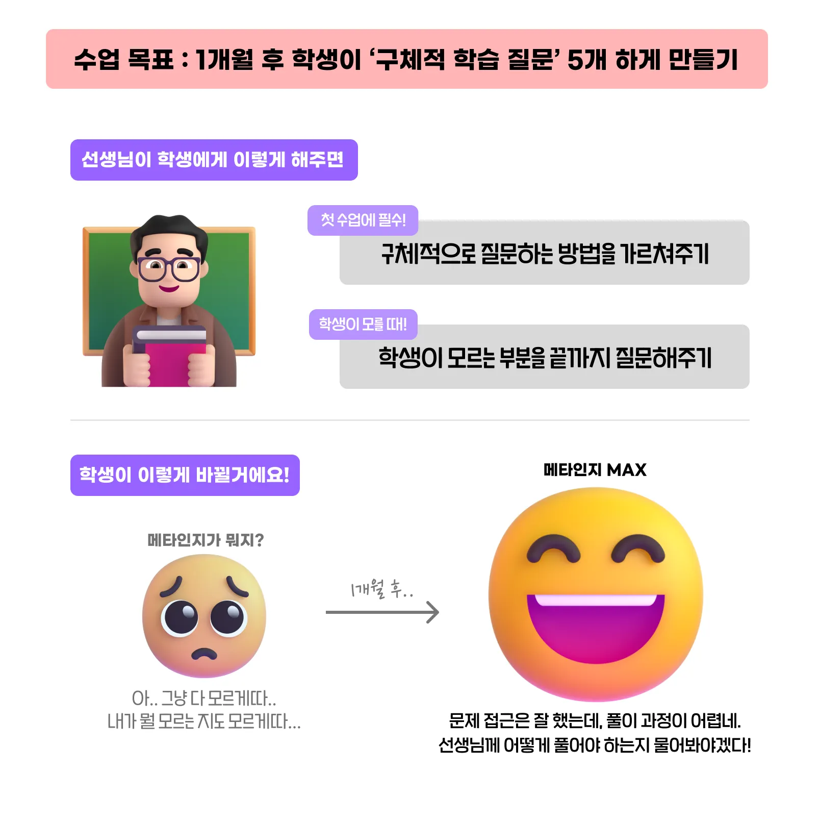 선생님의 이런 질문들을 통해, 학생은 조금씩 스스로 어떤 부분을 모르는 상태인지 잘 파악하게 되고, 점점 더 ‘구체적인 질문’을 하게 될 거에요!