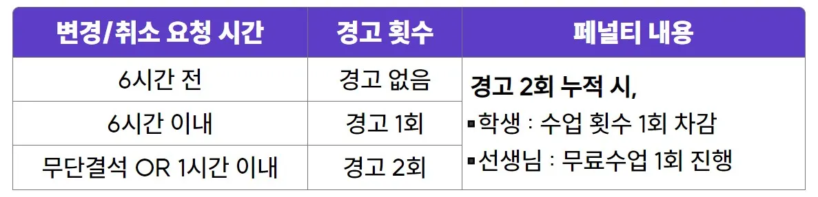 선생님 사유 경고 2회 페널티 : 무료수업 1회 추가