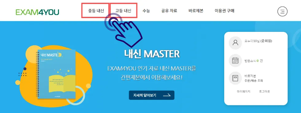 이그잼포유 홈 화면 상단에 중등 내신, 고등 내신 선택하여 내신 대비 자료를 다운받을 수 있습니다.