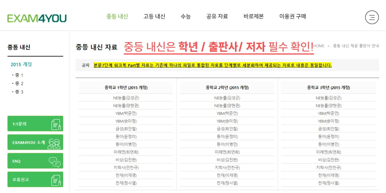 중등 내신의 경우 시험 종류도 선택해주시면 더 정확한 자료를 확인할 수 있어요.